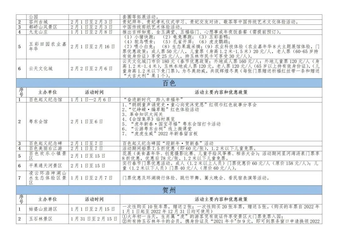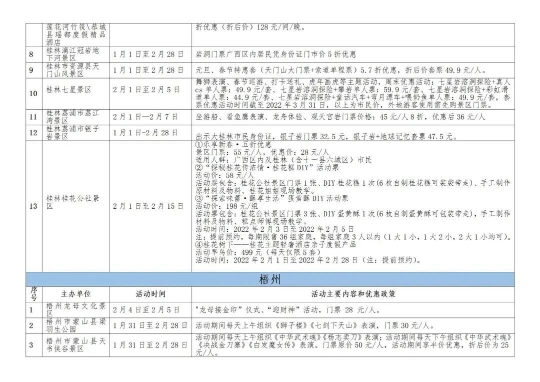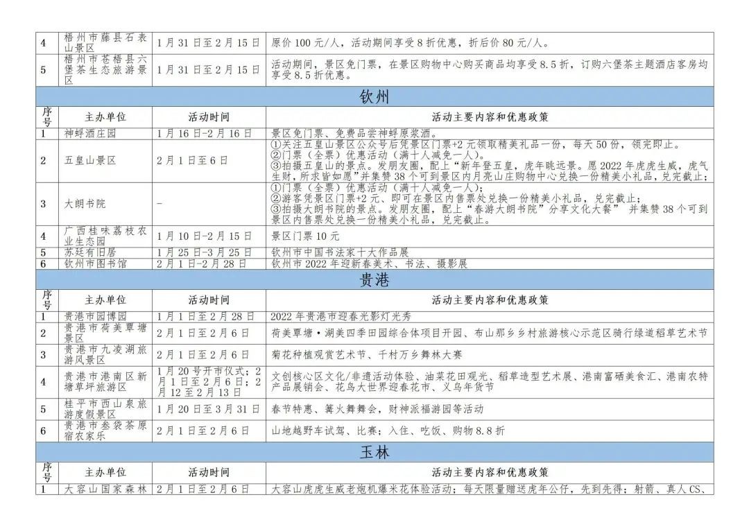 此外,贺州、梧州、玉林、钦州、崇左等地区的景区也策划了特色活动并配以优惠礼包,邀约全区人民前往游玩。