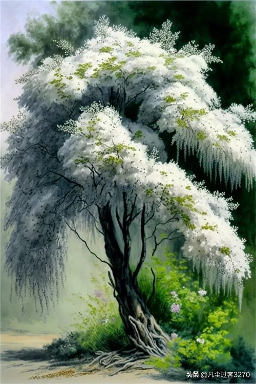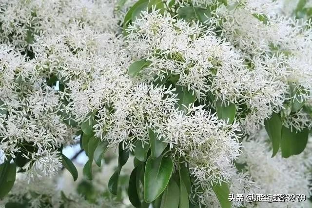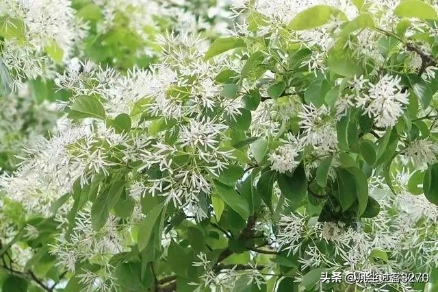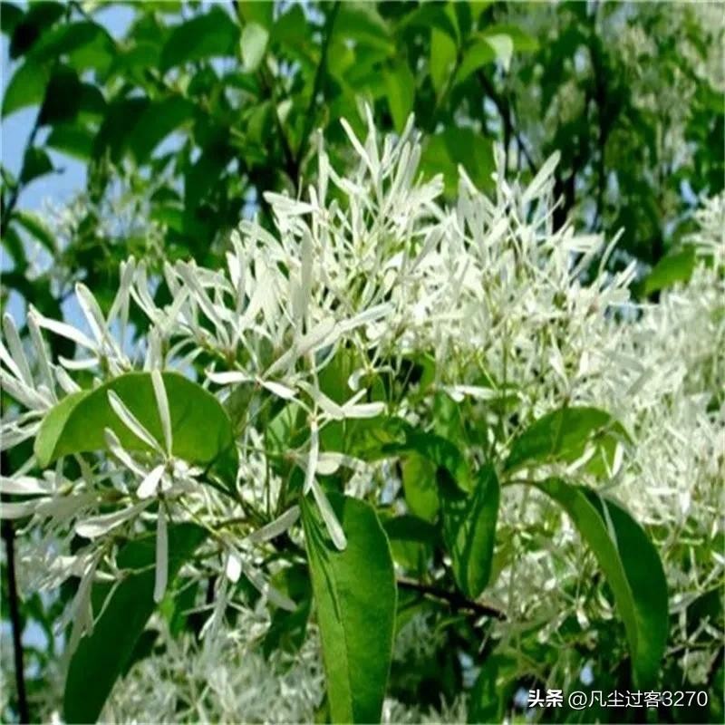 流苏树,木樨科流苏树属(Chionanthus)。别名萝卜丝花、四月雪(江苏)。中国甘肃、陕西、山西、河北以及南至云南、广东、福建、台湾等省生海拔3000米以下,日本、朝鲜也有分布。株高20米,耐低温,春末夏初开花,花期约10天。花和嫩叶晒干可代茶饮,具消暑止渴之功效。