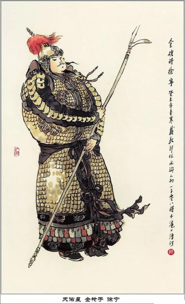 徐宁作为皇帝卫队金枪班的教头,哪能没有出众的武艺,连五虎上将林冲都这样评价徐宁的枪法“这徐宁的金枪法、钩镰枪法,端的是天下独步。”梁山攻打东平府时,徐宁大战董平,五十余合不分胜败,可见其武艺非同一般。