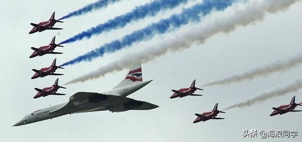 2002年,协和飞机在伊丽莎白女王登基50周年庆典上和英国红箭飞行表演队编队飞行