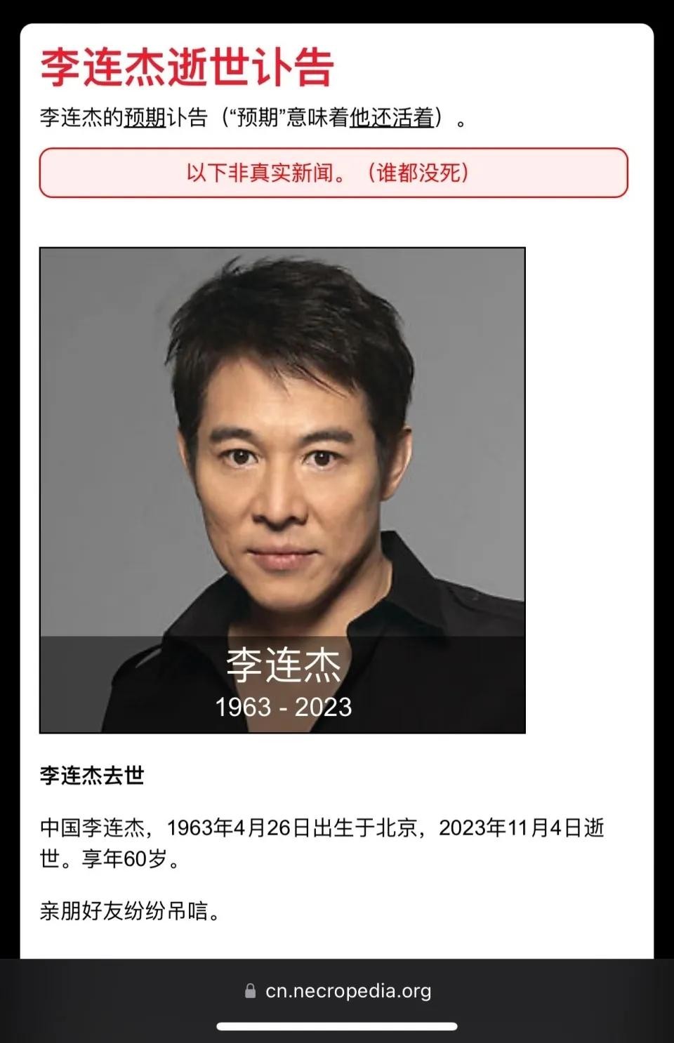 最近,一条外媒的讣告登上热搜,大意是说中国武打明星李连杰因病去逝,享年60岁。