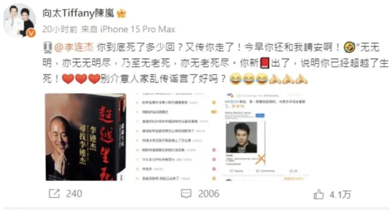 然而,向太陈岚在得知这一消息后,却是第一时间在微博上发声回应,向太调侃道:“你到底死了多少回?又传你走了,今早你还和我请安啊!……说明你已经超越了生死,别介意人家乱传谣言了好吗?”