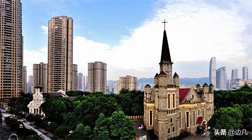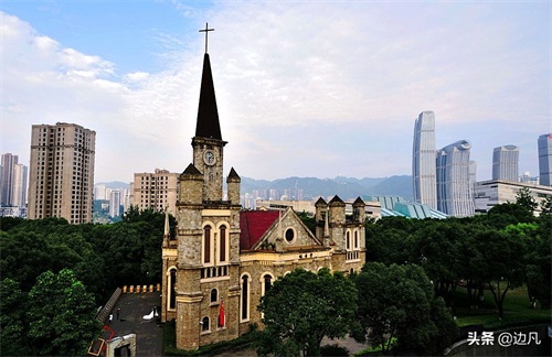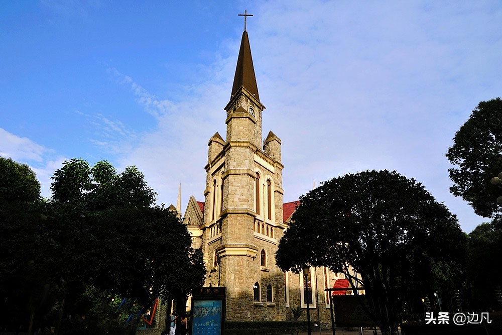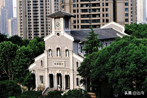 中央公园内两座风格各异的教堂相映成趣,前面一座浅色的天主教堂名为德肋撒教堂,后面一座深灰色的基督教堂叫福音堂。多年前,两座教堂曾是老江北城的亮点。