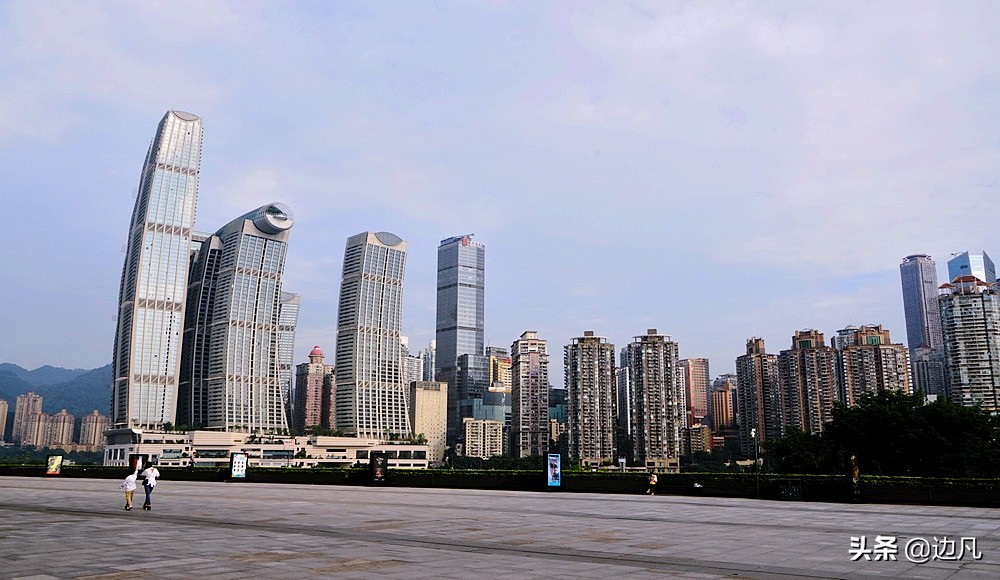 站在广场上,可以看到两江交汇,黄色的长江水与碧绿的嘉陵江水在交汇处泾渭分明,形成了一道独特的景观。