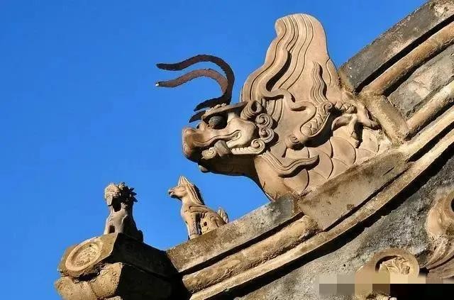 螭吻乃龙和鱼所育,鱼身龙头,好望喜吞,常常位于宫殿屋脊的边缘,做出吞脊之姿,常常被一把宝剑定住。螭吻深谙水性,是宫殿灭火的圣兽,又因鱼龙结合,逐渐有“鱼跃龙门”、“登者化龙”的美好象征。另一说为佛教的护法,有祛秽镇邪,保家安宅的作用。