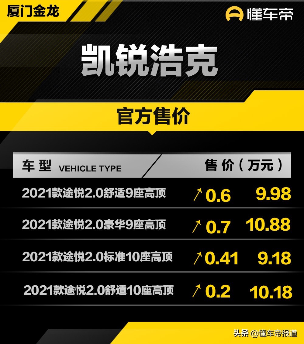 具体来看,本次涨价车型主要为凯锐浩克2021款9座和10座高顶车型,6座版车型价格不做调整。同时,新车在外观/内饰设计、配置等方面未做调整,继续保持2021款车型规格。