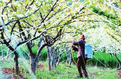 村民在给梨树做保养。