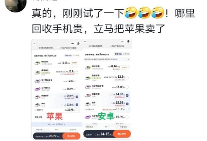 随后真的有网友对苹果手机和安卓手机的打车软件进行了测试果真,苹果手机的收费要比安卓手机贵出几块钱。