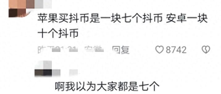 然而苹果手机的“特殊”并不仅仅体现在打车上,居然有网友说:苹果手机买抖音抖币一块钱七个抖币,而安卓手机是一块钱十个抖币。