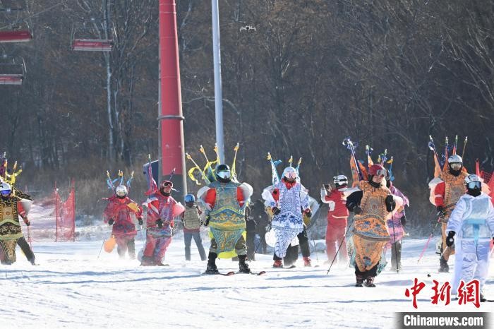 京剧装扮的表演团队在雪道驰骋。 石洪宇 摄