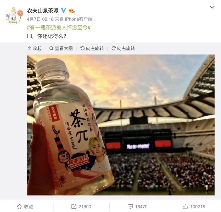 据悉,此品牌饮料在2016年曾邀请权志龙所属组合bigbang代言,而后权志龙入伍代言暂停。时隔四年后,又重新回归代言,品牌也很是长情,甚至在微博中也怀旧的发出四年前印有权志龙头像的饮料包装。