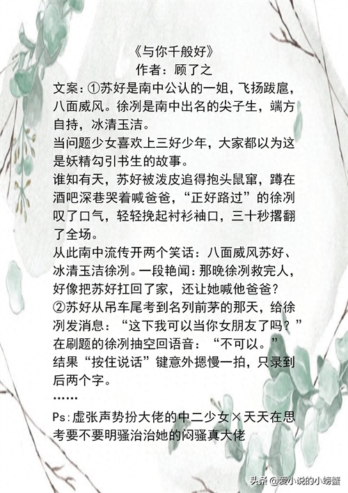 顾了之的古言现言都很好看哒,《霸王与娇花》《怎敌他晚来疯急》《你是迟来的欢喜》……真的都是我的菜,都能算是小甜文吧,《你是迟来的欢喜》还是我最喜欢的暗恋文呀!