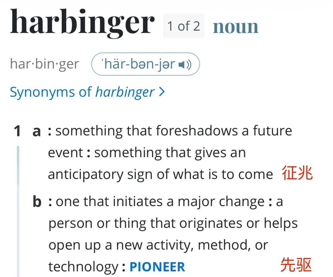 看到 harbinger /'hɑːrbɪndʒər/,你不会以为它的意思是"哈尔滨人"吧?