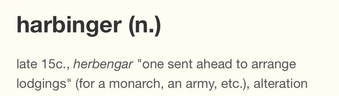 harbinger 源自法语,15世纪时的写法为 herbengar,指行军时走在大部队之前,为君王 (monarch) 或军队寻找住处 (lodgings) 的传令官。