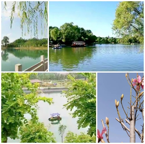 颍滨公园里面杨柳依依,花树处处。尤其到了春天,海棠花、山桃花、玉兰花、梣叶槭、紫藤花……繁华似锦,沁人心脾。
