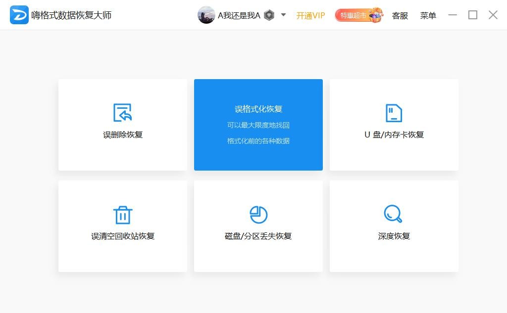 步骤1、运行电脑中的【嗨格式数据恢复大师】软件,软件总共有六个恢复模式,例如误删除恢复、误格式化恢复、U盘/内存卡恢复、误清空回收站恢复、磁盘/分区丢失恢复以及深度恢复,根据自己遇到的情况选择对应的即可,这里点击“误格式化恢复”。