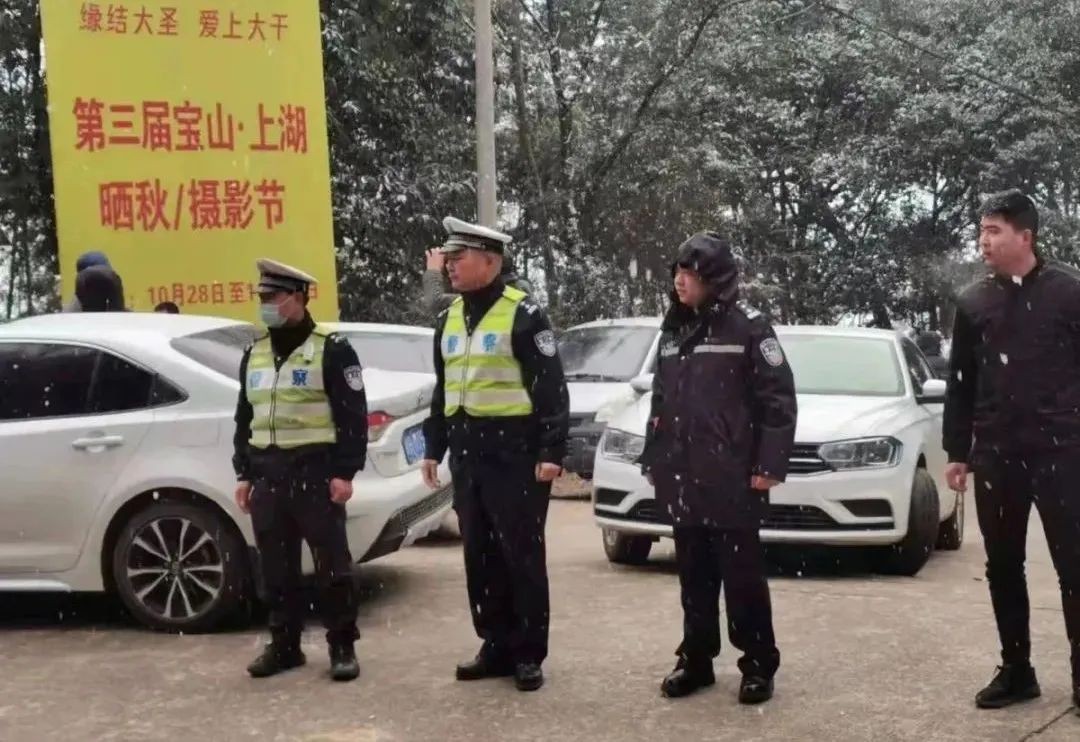 早在数小时前,天刚朦朦亮,李建斌便和全所民警上山执勤,清理路面落石和被雪压倒的竹子、树枝,除雪铲冰、立牌预警,引导群众有序赏雪。