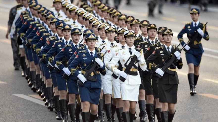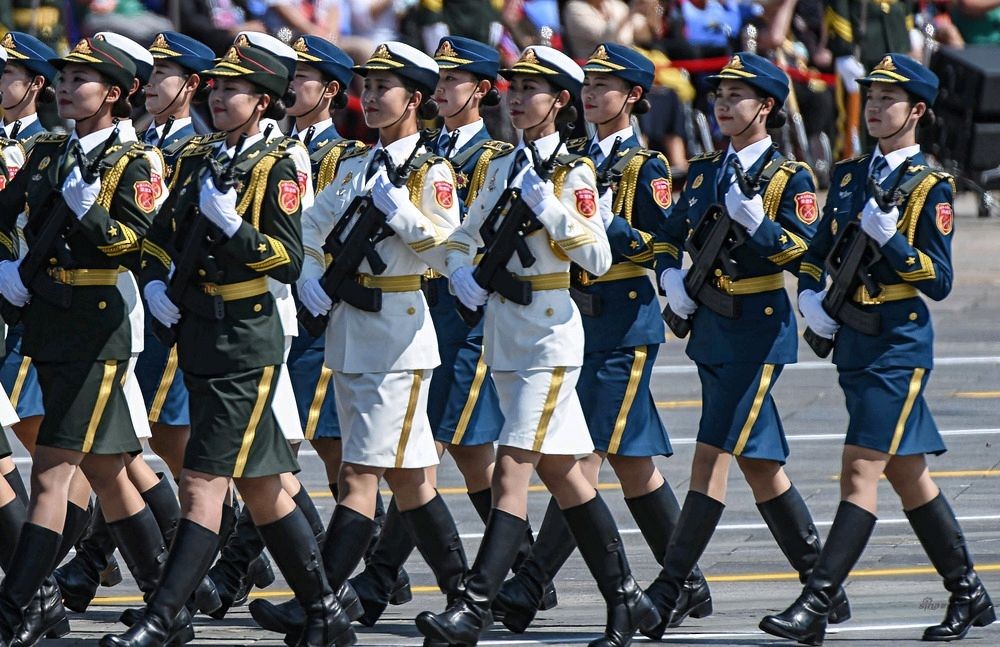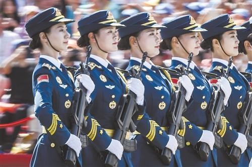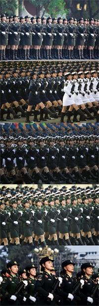 海陆空三军的女兵服装颜色分别为:海军为蓝色、陆军为绿色、空军为白色。阅兵仪式上海陆空三军的女兵迈着整齐的步伐向我们走来,好似一层层波涛汹涌的海浪,来势汹汹。中国女兵一出场,简直美到头皮发麻,她们的美是干净利落英姿飒爽的美!真的为祖国骄傲!英勇无畏的中国女兵用她们稳健的步伐、坚定的眼神、统一精致的军装,和不断发展壮大的队伍撑起了国人的门面。