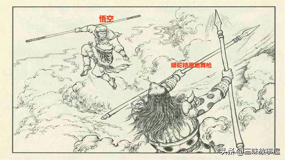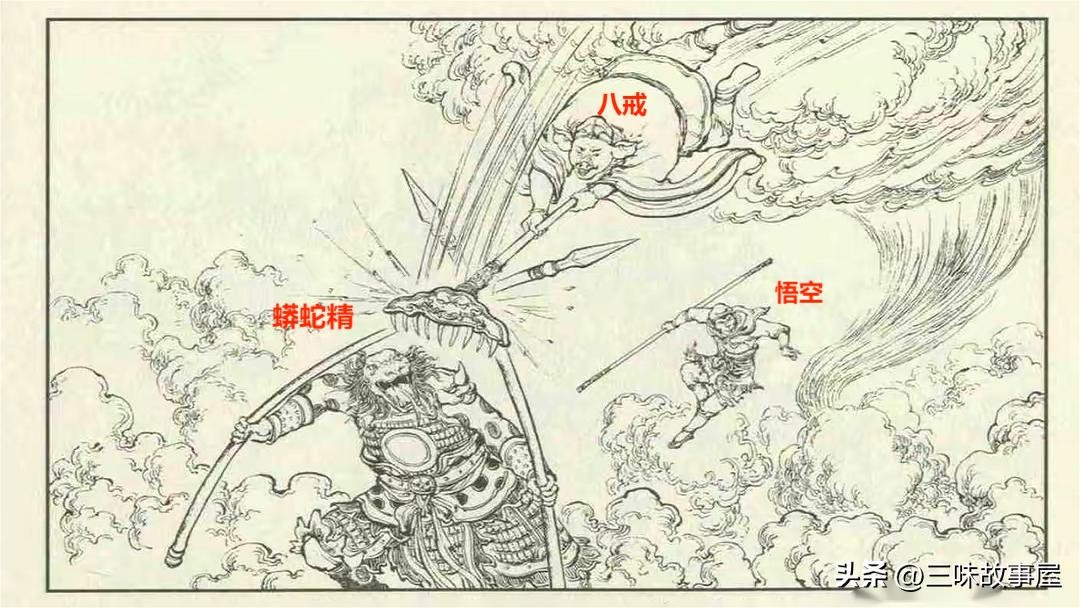 此时,猪八戒见迟迟不分胜负,便也上来助战,蟒蛇精见状便又抽出一条枪抵挡,她明明有两条枪,却一直用单枪招架悟空,可见,她对悟空并未使出全力,蟒蛇精单挑悟空时只有招架之力,现在猪八戒加入,二打一还是不分胜负,直到天亮,才主动撤退