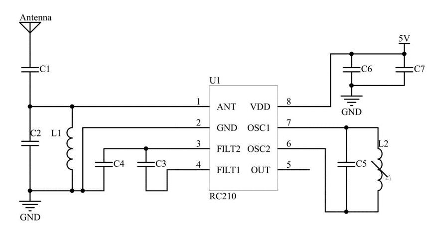 再下面的RC210G是瑞迪联电子出的315-433MHz的超再生接收芯片。该芯片最大数据速率为5Kbit/s,封装为SOP8。该芯片在立创商城上价格是0.58元。典型应用电路如下: