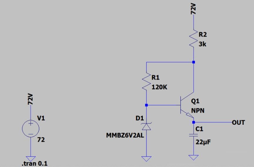 所以这是一个把72V电压降低到5V的降压电路,但是成本极低,大约1.5毛就可以搞定。这个电路的局限就在于,能输出的电流非常小。超过10mA的连续电流输出,就已经有很高的风险了。