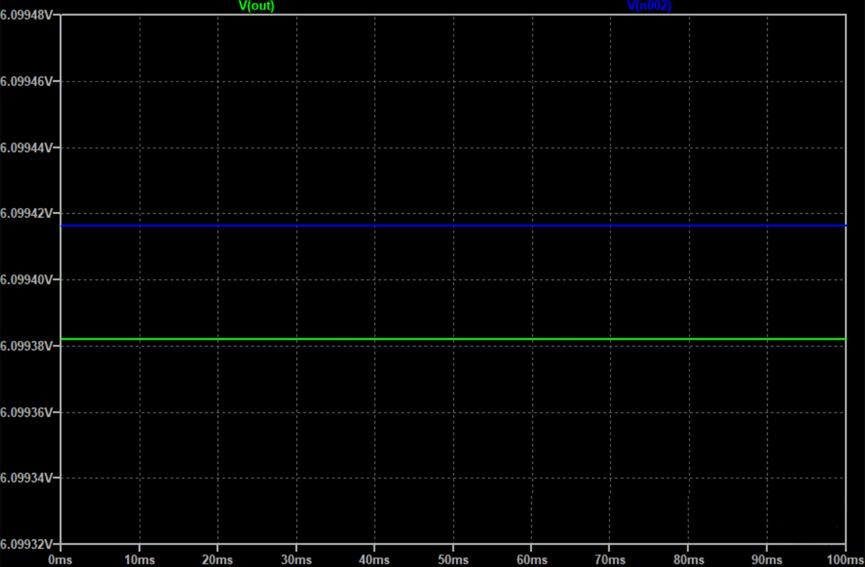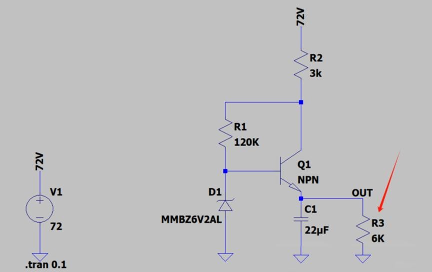 仿真可以看到,当三极管基极电压是6.09942V时,OUT的电压是6.09938V,效果还不错,现在我们给这个电路加一个负载再进行仿真: