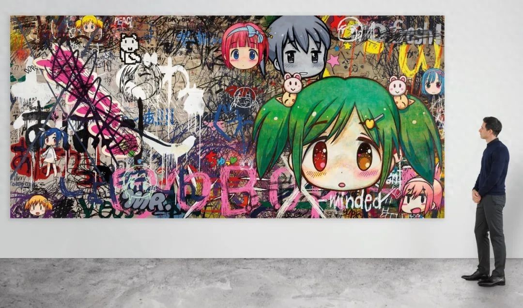 Mr. 为“超扁平文化”鼻祖村上隆的得意门生。他的作品完美融合日本的卡哇伊美学与高阶艺术,画面中的动漫美少女与街头涂鸦的结合无不带着繁忙都市的喧嚣热度。Mr. 的灵感来自1990年代的经典女性主角动漫,在那个时代,日本动漫文化中女性角色开始崭露头角并大受欢迎,Mr. 在自己绘画中开始以女性为主题向大众展现了女性的精神力量。