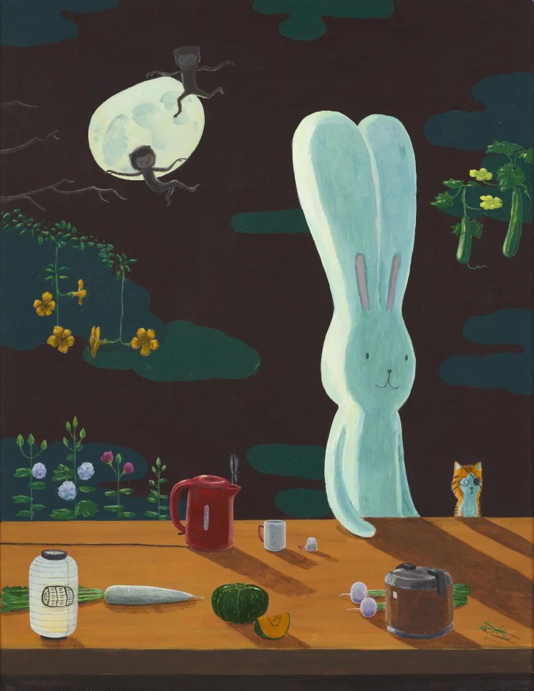 流行文化之外,也有一群日本当代艺术家专注于日本传统文化与自身创作的紧密联系,并使用前卫的当代艺术创作技法,展现出独树一帜的气质。加贺温标志性的兔子形象在日本传统故事中频频出现,另外画面中常见的蔬果、灯笼、圆月,以及亮相春拍的这件《九月,京都,白昼越发短暂》中提及的初秋九月及古都京都,均呼应日本传统文化,既具有当代感,又不失和风的浪漫韵味。