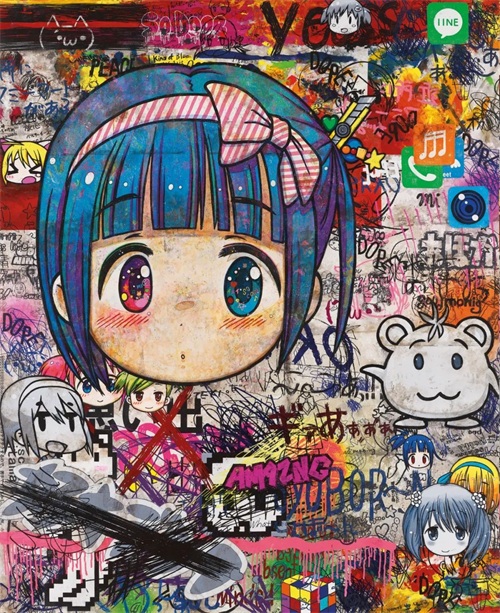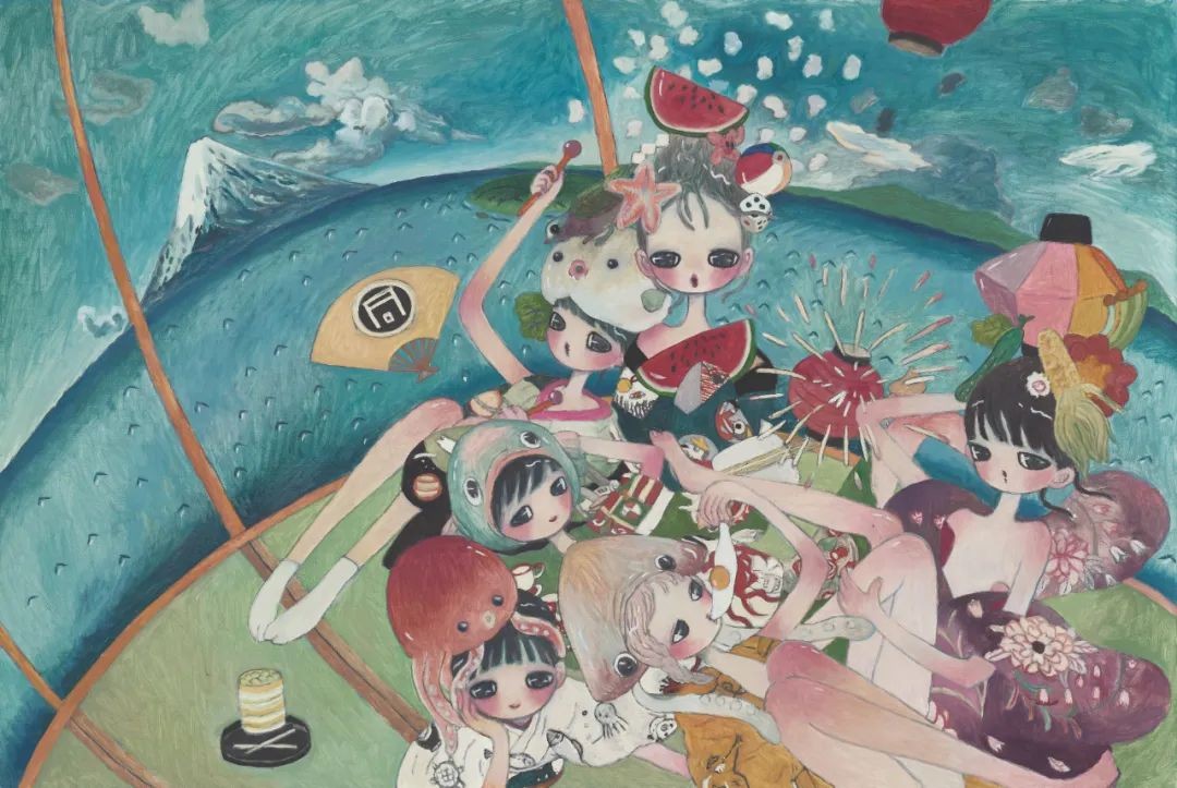 六角彩子是卡哇伊美学的佼佼者,作为女性艺术家,其作品呈现出有别于男性艺术家的独特感性与坚定信念。六角彩子画中的小女孩自由地穿梭于色彩的海洋中,炯炯有神的大眼和长长的手臂为观者展示女性的生命力和自由的意识形态,为当代艺术更添深度。