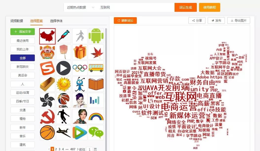 比如优妹儿输入了“互联网”的关键词,再点击相应的图标,就得到了想要的词云图,这些数据都是自动生成近期最新热点数据,你也可以根据你的想法再进行编辑更改。