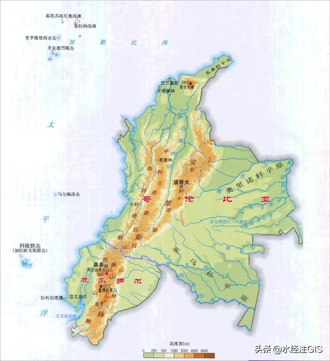 南美洲地形复杂,以安第斯山脉为脊骨,西高东低,平原与高原南北纵列分布。