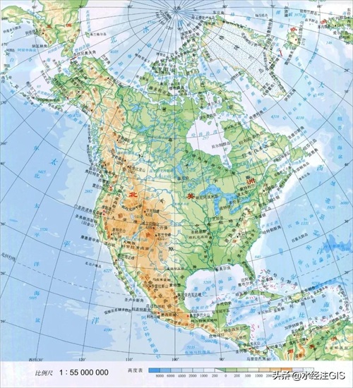 北美洲地形由西部高大山系、中部广阔平原和东部低缓高地组成,形成南北纵列分布的特征。