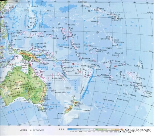大洋洲地形以高原山地为主,岛屿众多,地势东西两侧高而中部相对较低。