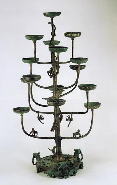 河北平山县中山国王陵中发现的两件铜灯便是“华英”灯盏的代表作,一是铜人两手执灯盏,人头是银制的,还安有两颗黑宝石的眼球。另一件是十五盏铜灯,以一树为灯杆,上面有十五个灯盏,树上和树下还塑造出一群动态各异的猴子,意趣盎然,生动可爱。看来,战国时期的灯,不仅形式多样,而且制作精巧。