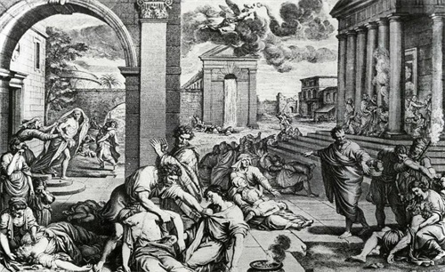 与此同时,整个意大利都开始采取紧急隔离措施,阻止热那亚和威尼斯两国公民入境。次年夏天,一位热那亚人到皮亚琴察探望亲戚,当时天下着大雨,城里的人不放他进去,他只好淋着雨在外面边哭边恳求。到了天黑时分,他的亲戚终于忍不住了,偷偷打开城门,带他回家过夜。次日早上,那位亲戚上街去……几天之后,皮亚琴察城里已经没有活人了。几周之内,米兰、都灵、维罗纳、佛罗伦萨……鼠疫所到之处,食品匮乏、物价飞涨、道德败坏、家庭破裂、教会崩溃、政府瓦解,似乎一切景象都在宣告着世界末日即将到来。
