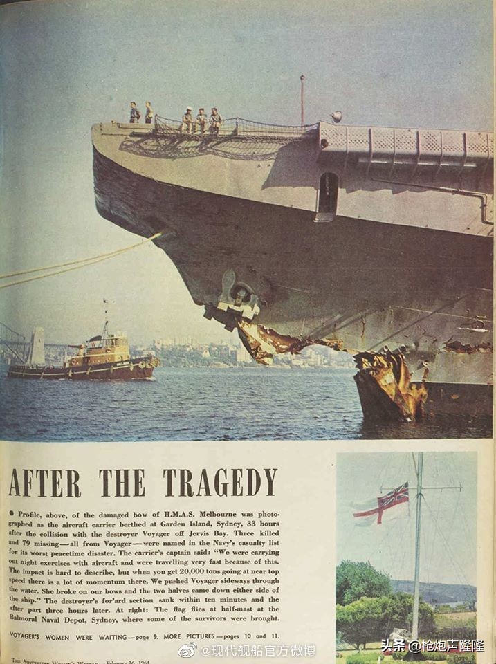 1964年2月10日,在海上航行的时候,“墨尔本号”竟然撞上了自己的护卫战舰——“航海者号”驱逐舰。“墨尔本号”一头撞向驱逐舰的中部,把驱逐舰劈成两半,顷刻间沉没。“墨尔本号”无一伤亡,船体受了点小伤,而“航海者号”驱逐舰上共有82名官兵殉职,事故最终的调查结果显示,“航海者号”驱逐舰的舰长严重失职,偏航进入了航母航道的水域。