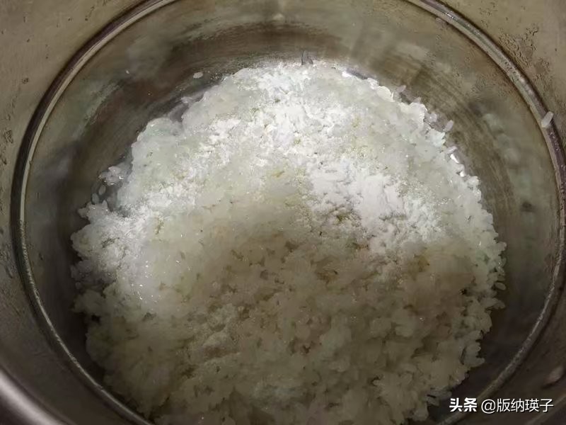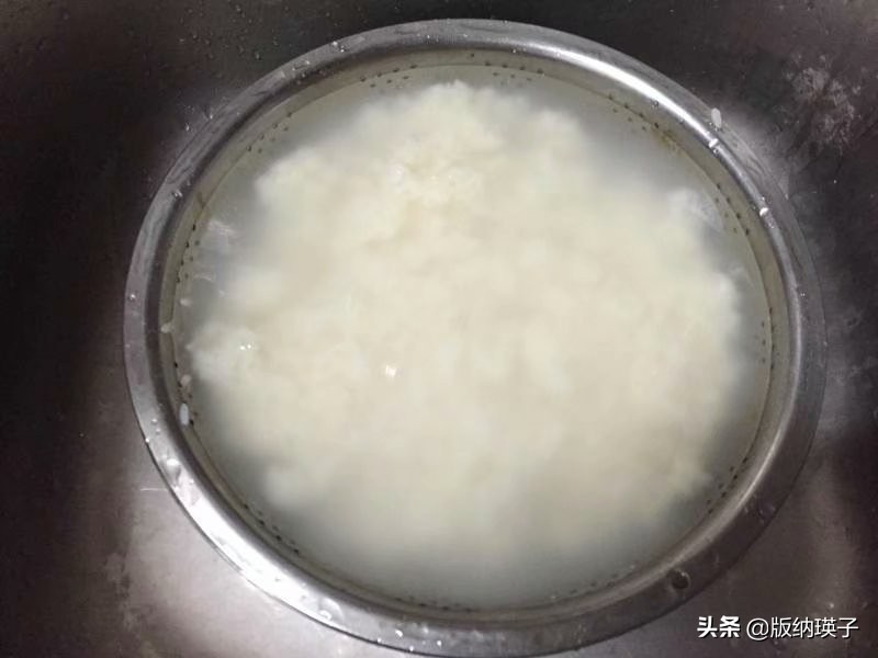 步骤一: 泡糯米(泡多少看你具体需求),泡4-6小时,如果天气热,最好中途换下水,不然米会泡坏了。手捻一下米粒,能捻成粉末就说明泡好了。