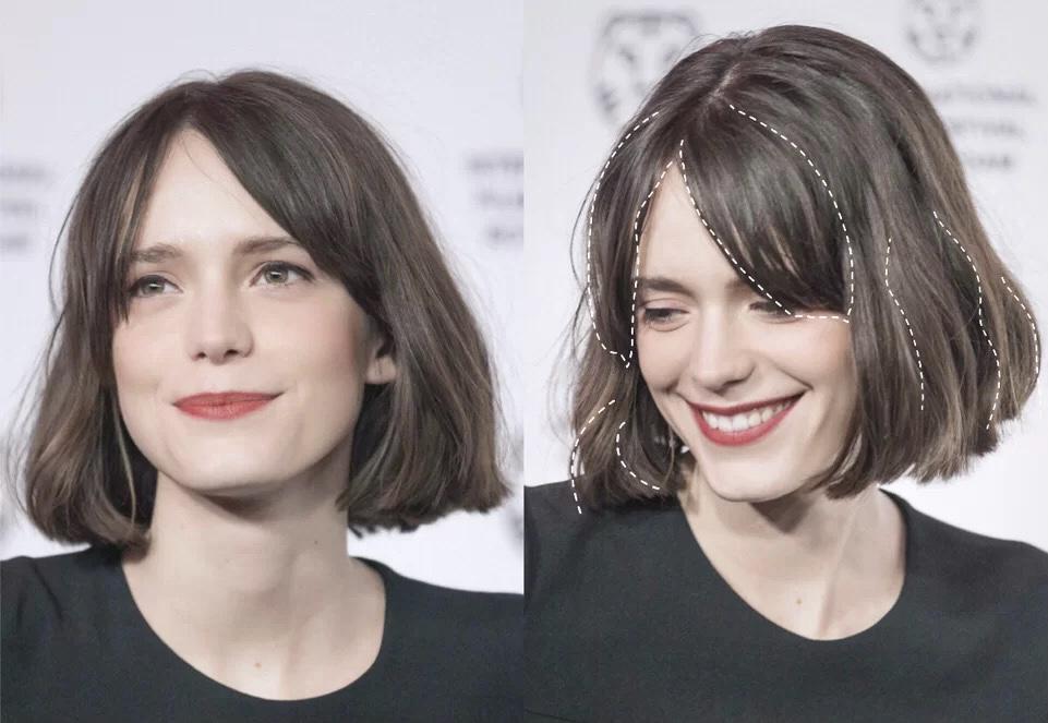 刘海为八字刘海,遮盖了长脸部分瘦削的脸部线条,也可以随意留少许头发在额头中间,给人一种随性自然的慵懒风。