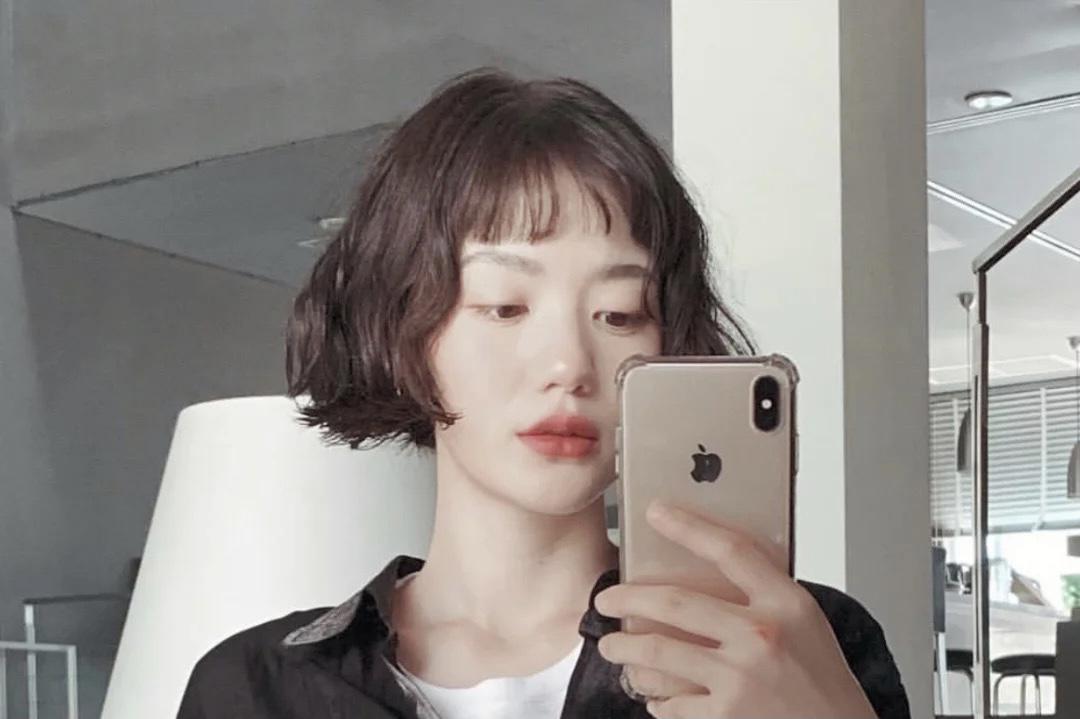 短发长度及腮,露出脖颈线条更显身材高挑,发尾微微外翻,加上稍微有点厚度的齐刘海修饰,很好地修饰了脸型。