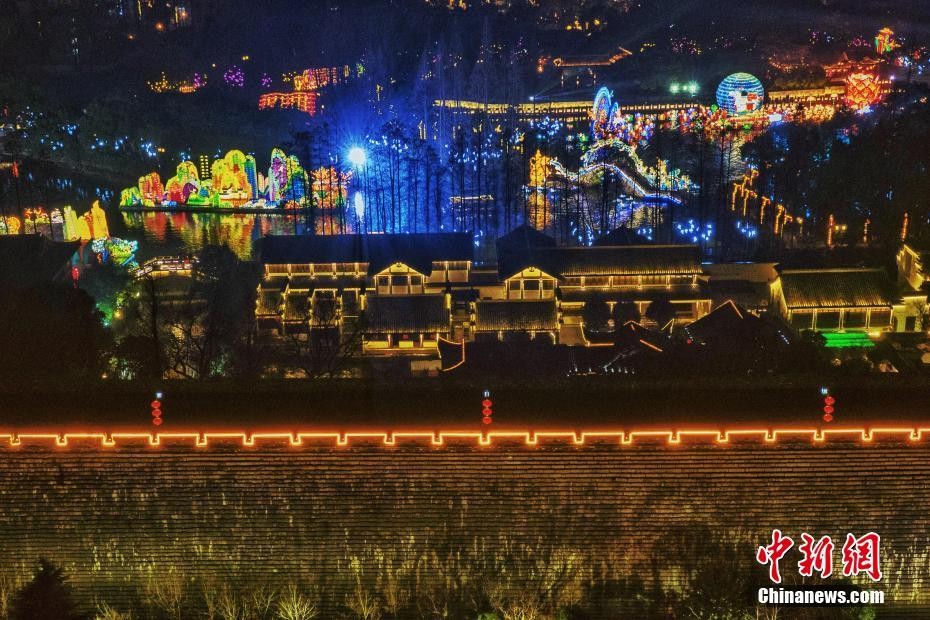 1月28日晚,第33届中国秦淮灯会正式亮灯,南京明城墙上下、秦淮河畔,各形各色的彩灯洋溢着出浓郁的年味。图为城墙上的灯饰多彩绚丽。中新社记者 泱波 摄