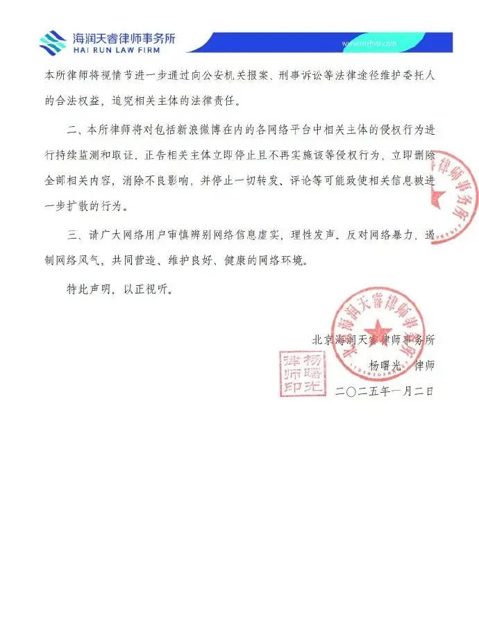 搜狐娱乐讯 1月2日,徐以若委托杨曙光律师发布声明,否认网传“殴打”赵露思、索要“天价解约金”等不实信息,“现已对相关网络用户的侵权行为完成取证,将视情节进一步通过向公安机关报案、刑事诉讼等法律途径维护委托人的合法权益,追究相关主体的法律责任。”