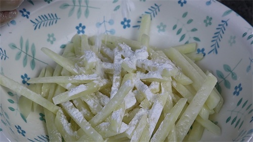 2、给土豆裹淀粉的时候要少量多次,这样炸出来颜色比较均匀。