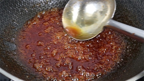 第五步:这是糖醋汁的黄金比例,先开大火,将料汁烧开,烧开以后用勺子不停地搅拌熬制冒大泡的时候,汤汁也比较浓稠,糖醋汁也就熬好了。把提前炸好的土豆条全部到锅中,开大火翻炒两下让土豆条表面均匀地裹上糖醋汁,这样一道美味可口的糖醋土豆桥就制作好了。
