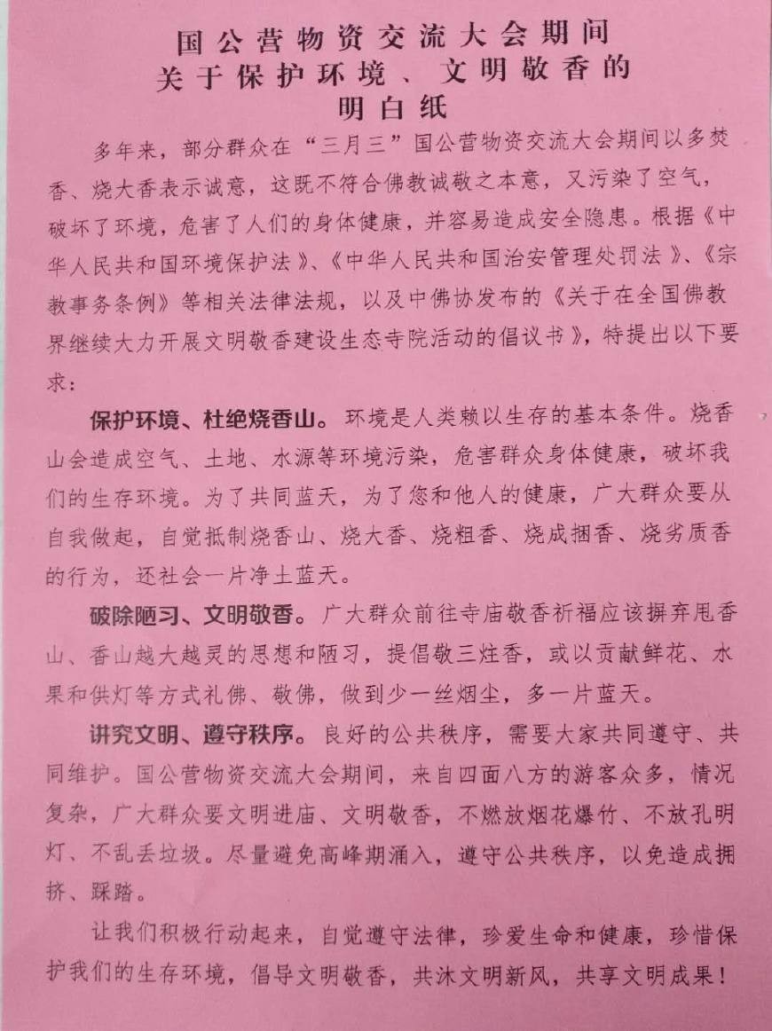 多年来,部分群众在“三月三”国公营物资交流大会期间以多焚香、烧大香表示诚意,这既不符合佛教诚敬之本意,又污染了空气,破坏了环境,危害了人们的身体健康,并容易造成安全隐患。根据《中华人民共和国环境保护法》、《中华人民共和国治安管理处罚法》、《宗教事务条例》等相关法律法规,以及中佛协发布的《关于在全国佛教界继续大力开展文明敬香建设生态寺院活动的倡议书》,特提出以下要求: