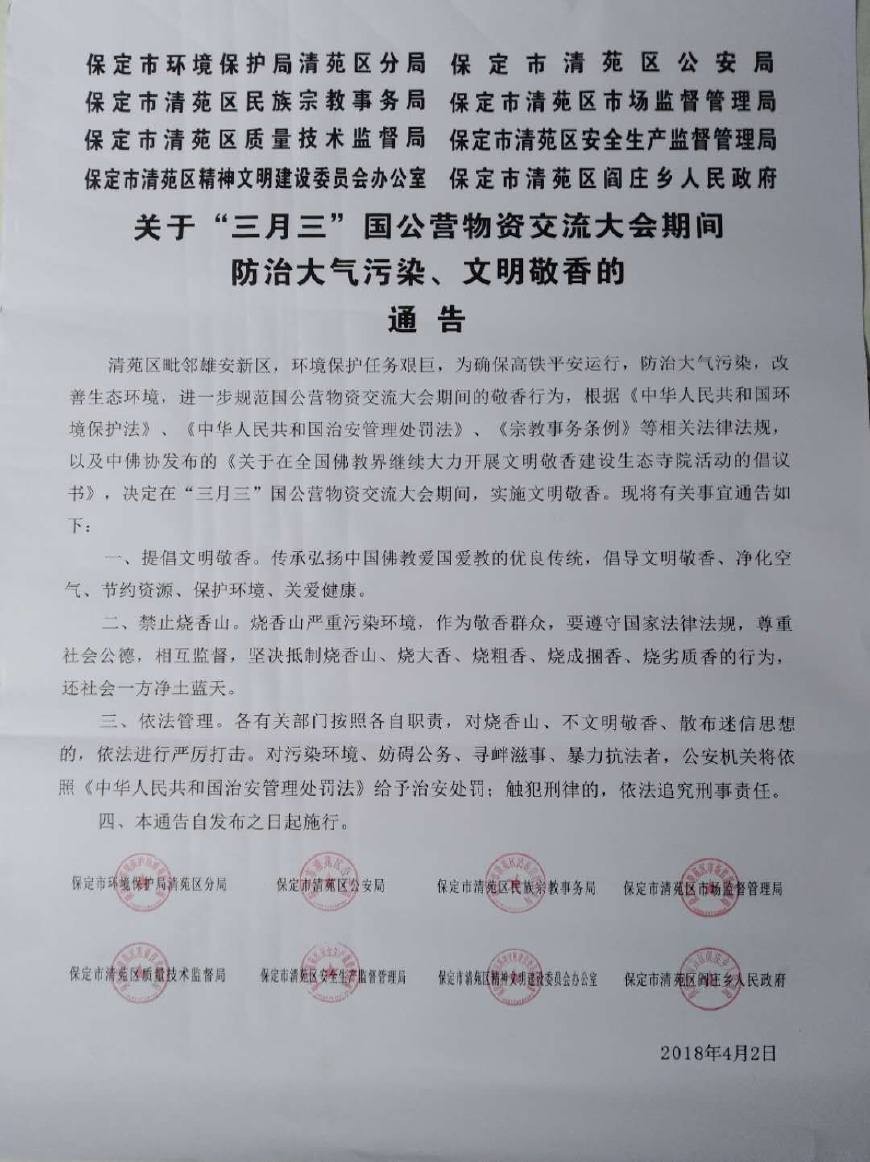清苑区毗邻雄安新区,环境保护任务艰巨,为确保高铁平安运行,防治大气污染,改善生态环境,进一步规范国公营物资交流大会期间的敬香行为,根据《中华人民共和国环境保护法》、《中华人民共和国治安管理处罚法》、《宗教事务条例》等相关法律法规,以及中佛协发布的《关于在全国佛教界继续大力开展文明敬香建设生态寺院活动的倡议书》,决定在“三月三”国公营物资交流大会期间,实施文明敬香。现将有关事宜通告如下: