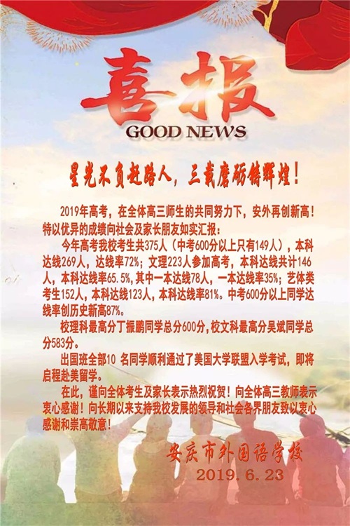 今年我校高考再创佳绩:全校600分以上共160人,(文科36人,理科124人),文科张彬帅同学以656分列全省第19名,安庆市第一名;陈卓同学以651分列全省47名,安庆市第二名;理科王可同学以678分列全省第108名,另有3名同学进入全省理科前200名。全校一本达线850人,本科达线1691人(上述数据均不含体艺)。
