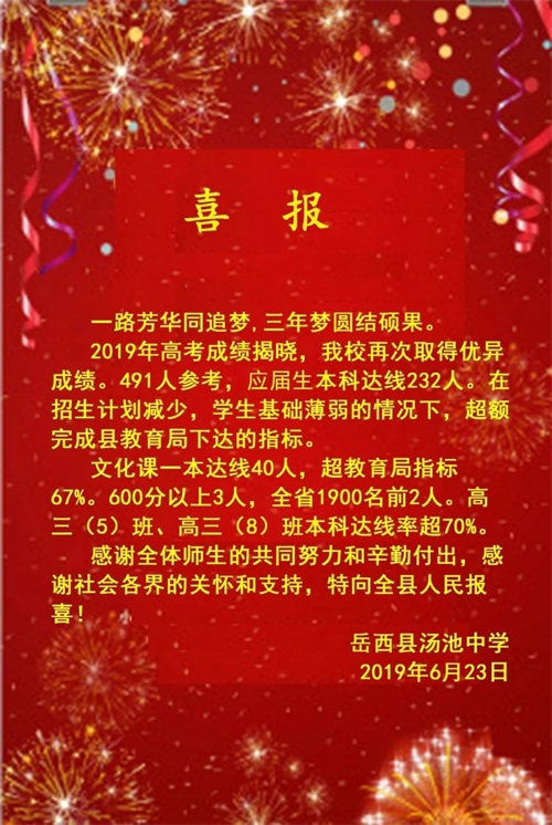 这一成绩的取得是各级领导关心支持的结果,是全体高三老师呕心沥血、辛勤耕耘的结果,是全校教职工齐心协力、团结奋进的结果。学校向创造这一佳绩的全体高三老师表示热烈的祝贺,向为学校发展辛勤奉献的广大职工表示崇高的敬意,向关心支持二中发展的各级领导、各位家长、社会各界表示衷心的感谢!
