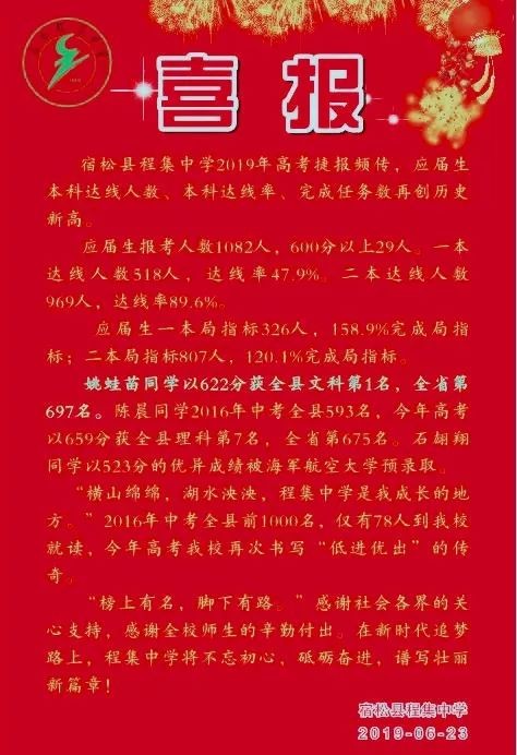 2019年我校再创佳绩。应届参考533人,理科最高分618分,文科最高589分,一本达线88人,二本以上达线327人,艺体达线10人。全校理科达线率高达80%,理科单班达线率高达91%。