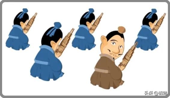本题画面解析:图中五人拿着竽(古代管乐器)四人放在嘴边吹,其中一人却拿着竽往回看。(仅供参考)