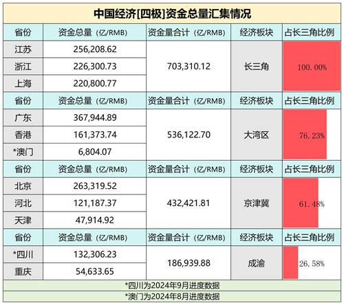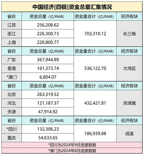 上海、江苏、浙江,两省一市在2024年10月的资金总量汇集总额达到了70.33万亿,成为当之无愧的第一极。